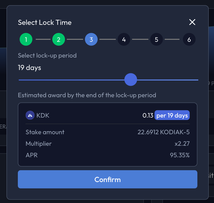 For Kodiak farms (separate from PoL Reward Vaults), there is a locking time period and selecting a higher lock time provides you with a higher multiplier to earn these rewards.